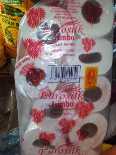 A pack of 10 rolls of Eurosilk toilet papers No.1. A carton of 10 packs is Ug shs. 178,000/= |
