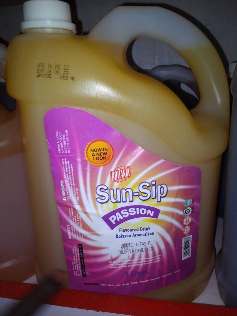 A box of Sunsip juice of 4 x 5L jerricans. Sunsip comes in mango, passion, apple, strawberry, and orange flavours. |